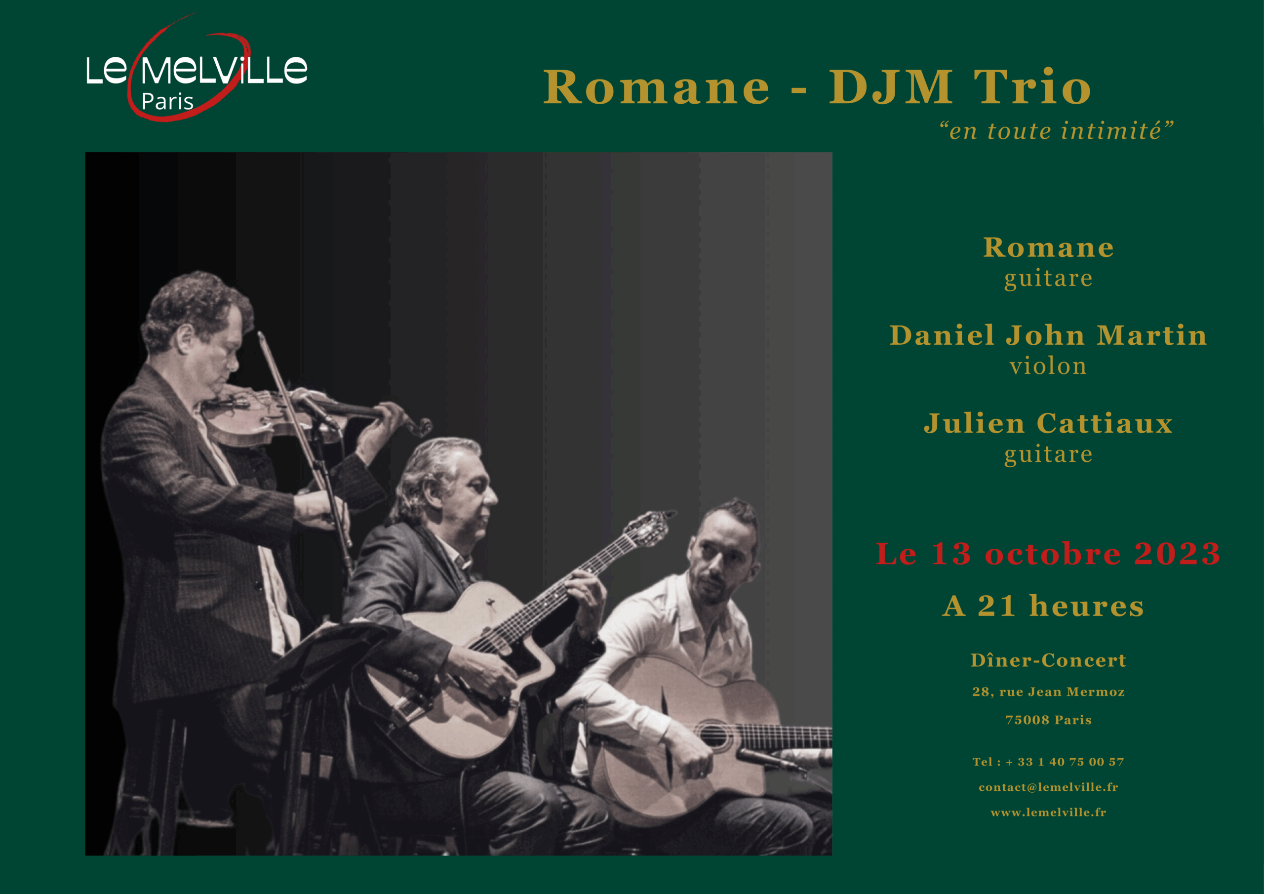 Ces trois monstres du Jazz manouche se produisent de manière exceptionnelle dans l'écrin du Melville. Romane sera accompagné à la contrebasse par Daniel John Martin et à la guitare par Julien Cattiaux. L'intimité avec le public fait écho à celle des artistes pour une soirée qui s'annonce magique.